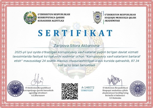 В соответствии с приказом Министерства высшего образования, науки и инноваций от 25 апреля 2025 года №147 «Об обеспечении исполнения Указа Президента Республики Узбекистан от 21 апреля 2025 года №УП-71 «О мерах по эффективной организации выполнения первоочередных задач по дальнейшему совершенствованию системы противодействия коррупции» и постановления Президента Республики Узбекистан от 21 апреля 2025 года № ПП-147 «О мерах по обеспечению независимости и повышению эффективности деятельности подразделений внутреннего антикоррупционного контроля государственных органов и организаций»», а также на основании приказа Филиала от 20 августа 2025 года №144-п «Об организации дистанционного обучения на курсах «Виртуальной академии противодействия коррупции»» в августе-сентябре т.г. 15 сотрудников Филиала успешно прошли обучение с получением подтверждающих сертификатов, из них 11 человек (73%) освоили программу обучения на оценку «отлично», 4 человека (27%) – на оценку «хорошо».