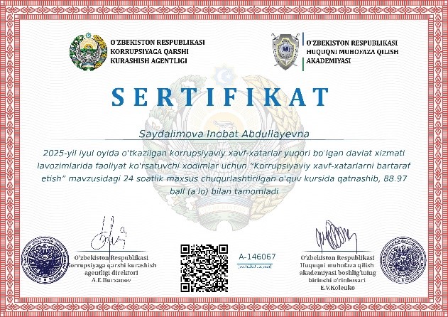 В связи с этим с 1 января 2025 года в Узбекистане запущена электронная площадка «Виртуальной академии по противодействию коррупции», определена образовательная концепция, разработана онлайн-платформа и создан учебный контент. Здесь пользователи смогут ознакомиться с нормативными документами и стандартами в сфере противодействия коррупции, высокими стандартами этического поведения, понятиями конфликта интересов, антикоррупционными механизмами и другими важными аспектами борьбы с коррупцией.