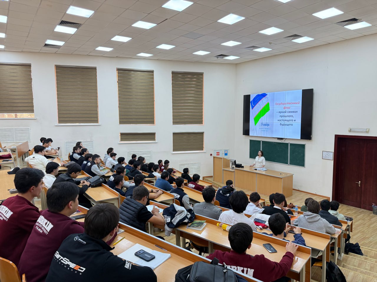 Выступая перед студенческими аудиториями, педагоги кафедры «Социально-гуманитарные дисциплины» акцентировали внимание на становлении Государственного флага, направленного на сохранение истории народа, его традиции и менталитета. Было отмечено, что флаг объединяет всех граждан в стремлении сделать свою страну сильной и процветающей, выражает истинные идеи и принципы государства. Нашему великому предку Амиру Темуру его учитель (пир) перед сражением подарил флаг и барабан, а в напутствие дал наставление: «Если во время боя выживет даже один солдат, он должен высоко держать флаг страны, так как опущенный флаг означает поражение государства». Примечательно, что флаг свидетельствует о великих победах нашего народа в боях, проявлением отваги и мужества.