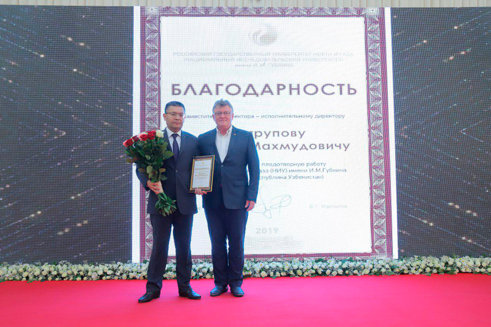 Проректор РГУ нефти и газа имени И.М.Губкина по учебной работе доктор химических наук, профессор, действительный член Российской академии естественных наук по Секции нефти и газа Владимир Кошелев после приветственного слова вручил Благодарственное письмо от имени Ректора РГУ нефти и газа имени И.М.Губкина доктора экономических наук, профессора Виктора Мартынова исполнительному директору Филиала профессору Абдулле Магрупову и декану факультета доценту Шавкату Равилову.