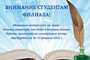 We announce an essay-contest on the topic: “I open the book like a door to a big life”. We ask you to send your works to e-mail odpr@gubkin.uz until February 13, 2021 Prize fund: Diplo...