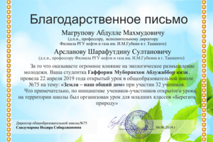 Gratitude for the education of worthy students Currently, one of the most urgent issues at the state level is the issue of the attitude of young people towards ecology. It should be noted that since ...