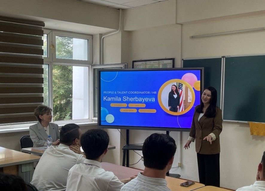 Мастер-класс на тему «HR, рекрутинг и поиск работы: взгляд изнутри» был посвящён современным подходам к трудоустройству, методам эффективного рекрутинга и особенностям карьерного роста в международной среде. Камила Шербаева, обладая практическим опытом в международной компании, поделилась с участниками важными инсайтами о том, как строится работа HR-отдела изнутри, какие качества ценятся работодателями, и как выпускникам выгодно заявить о себе на глобальном рынке труда.