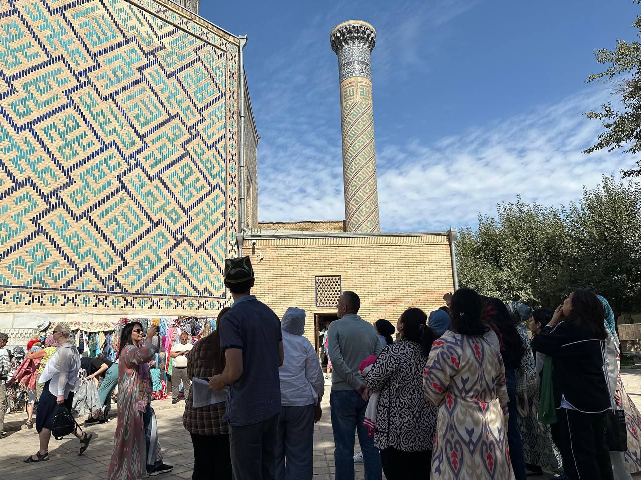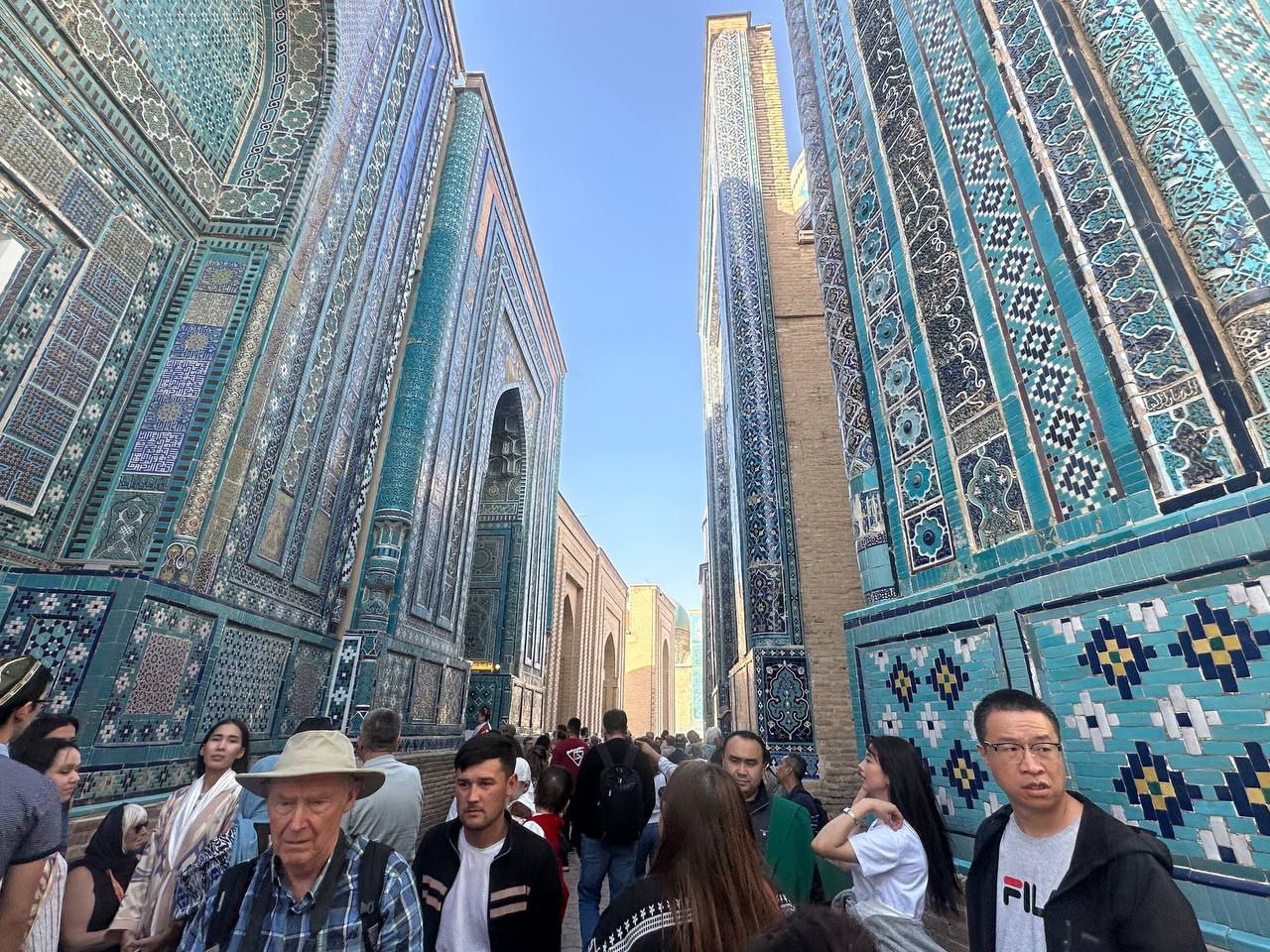 Посещение достопримечательностей началось с ансамбля мавзолеев Шахи-Зинда (XII–XV вв.), известного своим богатым архитектурным декором — мозаикой, терракотой и майоликой.