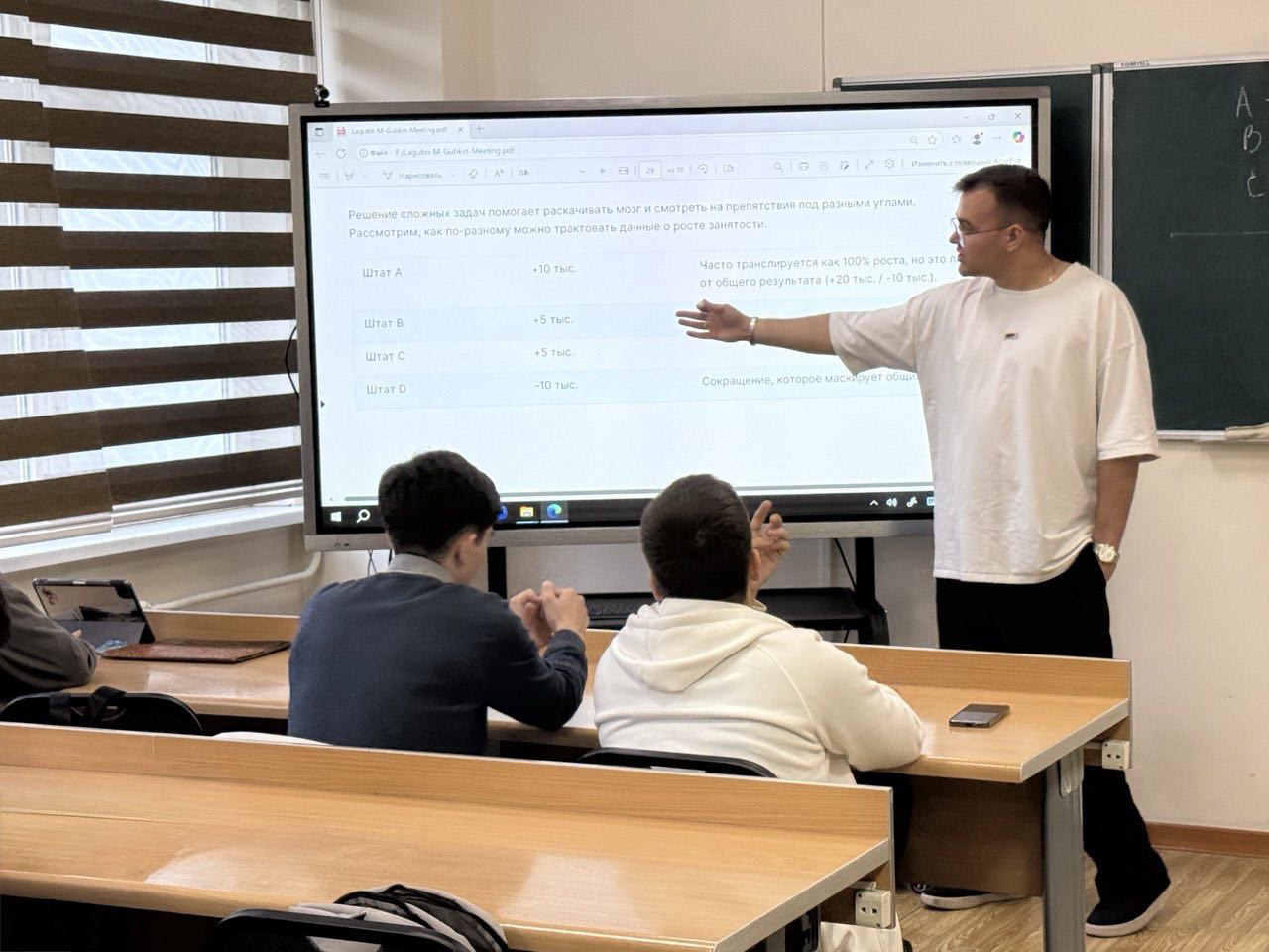 Во время интерактивной части встречи участники решали статистические и логические задачи, развивающие критическое мышление и навык проверки информации. Михаил отметил, что современные компании ценят не только диплом, но и умение анализировать, адаптироваться и мыслить стратегически.