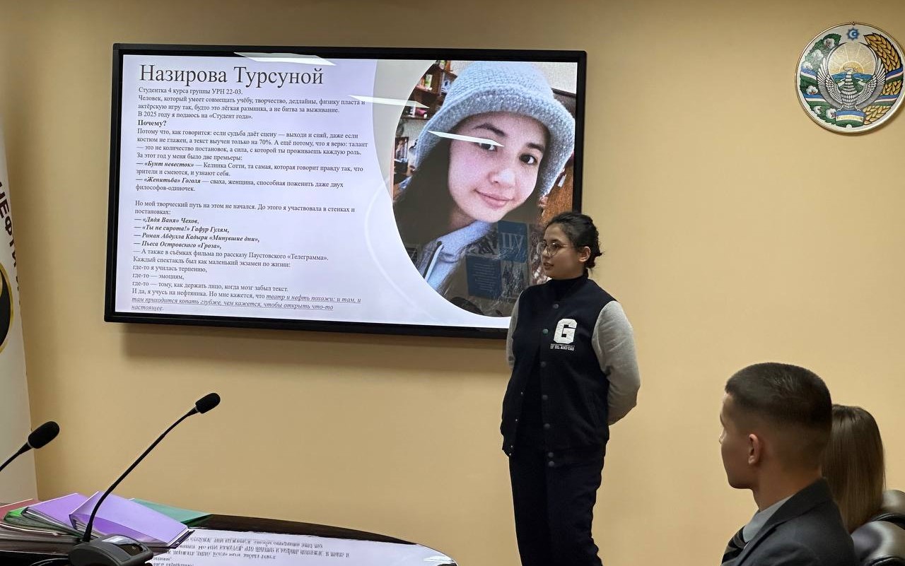 В соответствии с совместным постановлением Министерства высшего образования, науки и инноваций Республики Узбекистан (27 с/п), Министерства культуры (01-17-15), Агентства по делам молодежи (01-07/21), Художественной Академии Узбекистана (03-03 с/п) и Академии Наук (2/5) от 25 июля 2024 года «О проведении республиканских конкурсов «Самый активный студент года», «Самый активный ученик года» и «Знаток реформ»» среди студентов высших образовательных учреждений», в Филиале РГУ нефти и газа (НИУ) имени И.М.Губкина в городе Ташкенте был проведён 1-й этап конкурса «Самый активный студент года», проводимом среди студентов высших учебных заведений Республики Узбекистан.