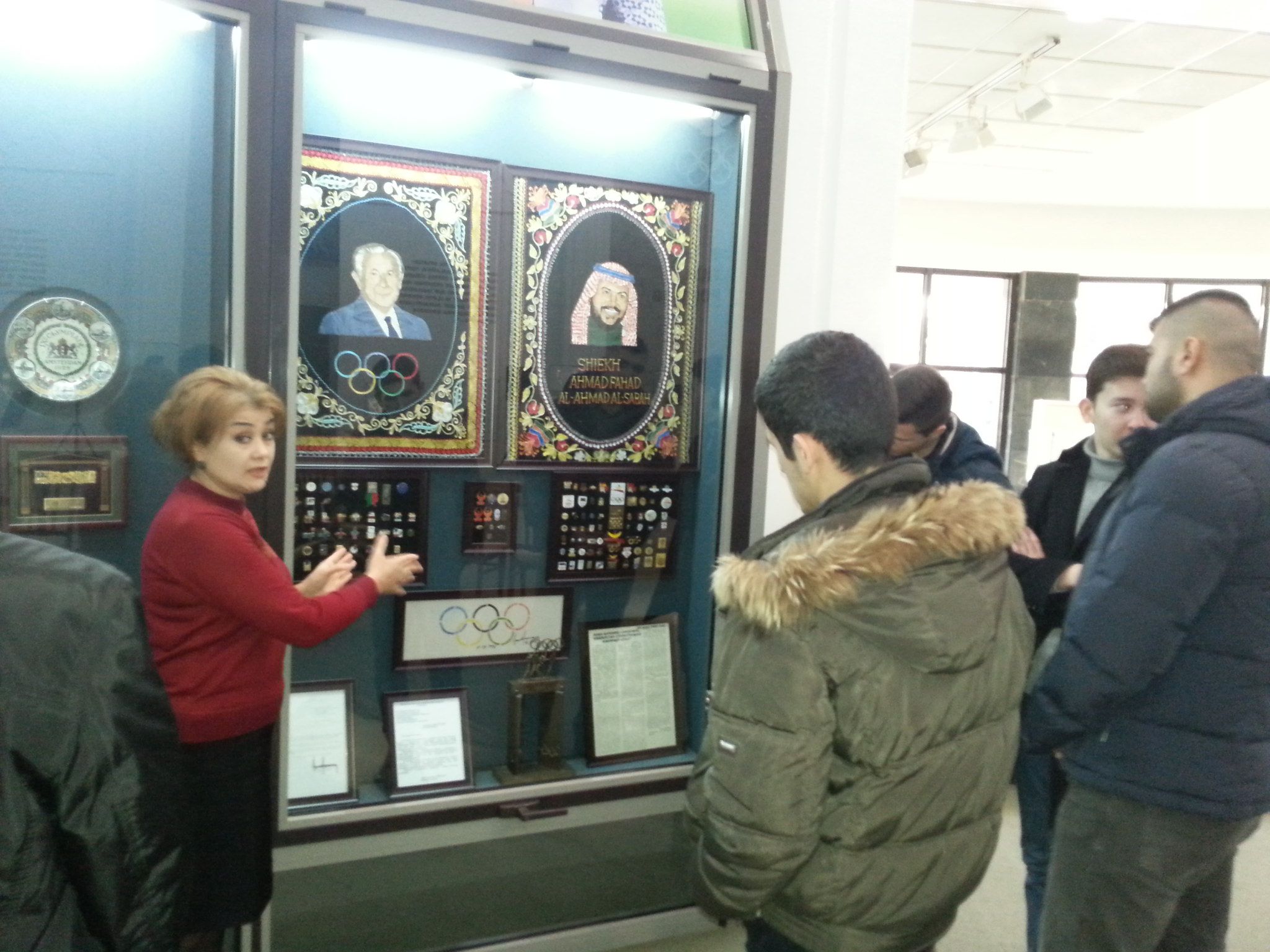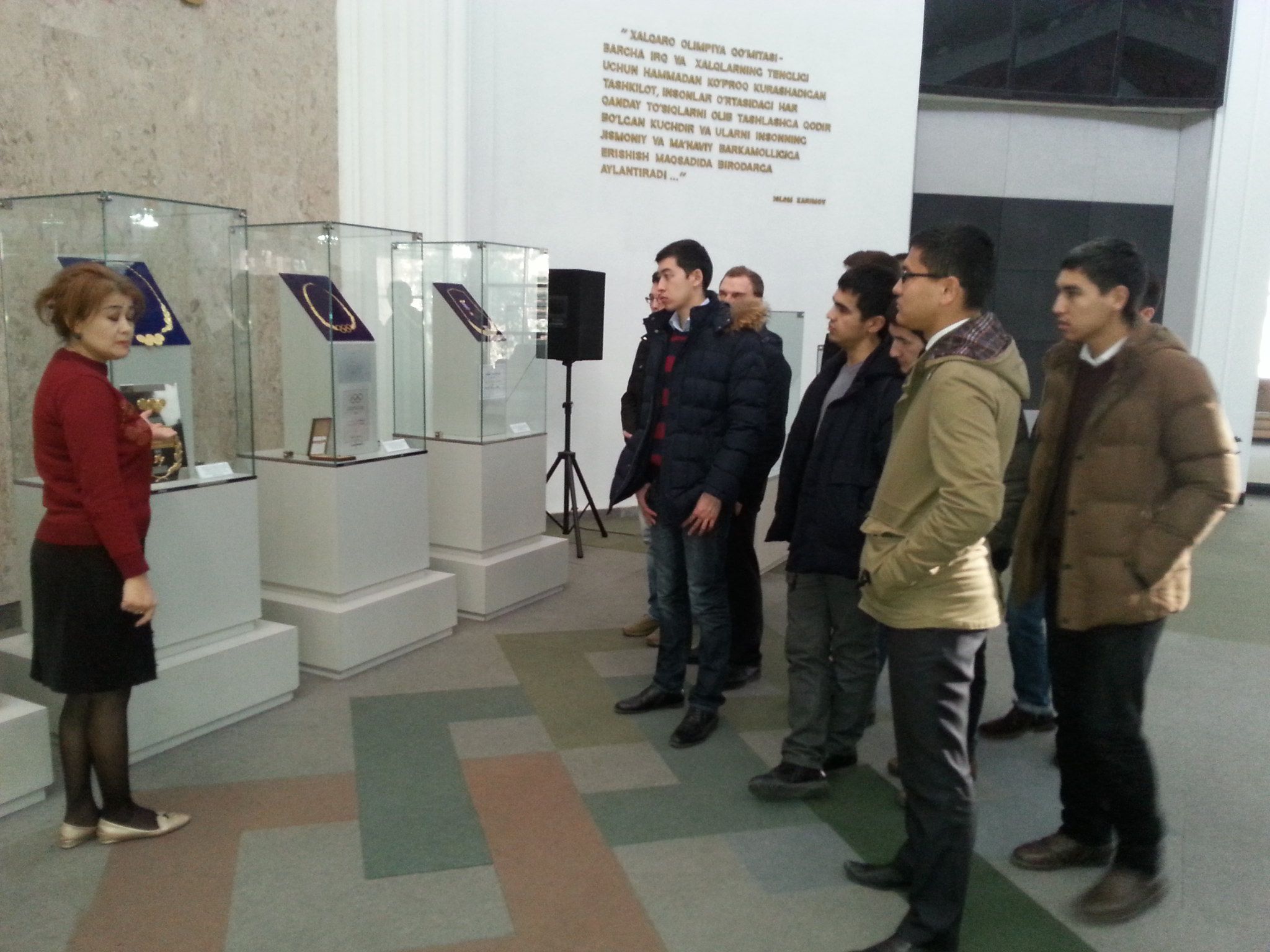 Экскурсовод рассказал о почётной экспозиции, где выставлены, переданные музею Первым Президентом Республики Узбекистан Исламом Каримовым награды, вручённые ему за выдающийся вклад в международное олимпийское движение, развитие спорта – Золотой орден Международного Олимпийского комитета, золотой орден Азиатского Олимпийского Совета, Золотое ожерелье Международной федерации борьбы, Золотой орден Международной федерации Кураш, а также кубки и сувениры. В музее экспонируется большое количество раритетных медалей, кубков, памятных монет, знаков факелов, сувениров, почтовых марок, художественных полотен, спортивного инвентаря и одежды , печатной продукции, связанных с историей Олимпийских и Азиатских игр, чемпионатов мира, континента престижных международных соревнований. Экскурсия оставила неизгладимое впечатление, студенты получили интересную информацию о высших достижениях наших спортсменов в Олимпийских играх и международных соревнованиях.