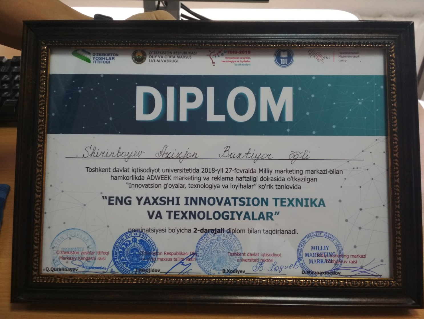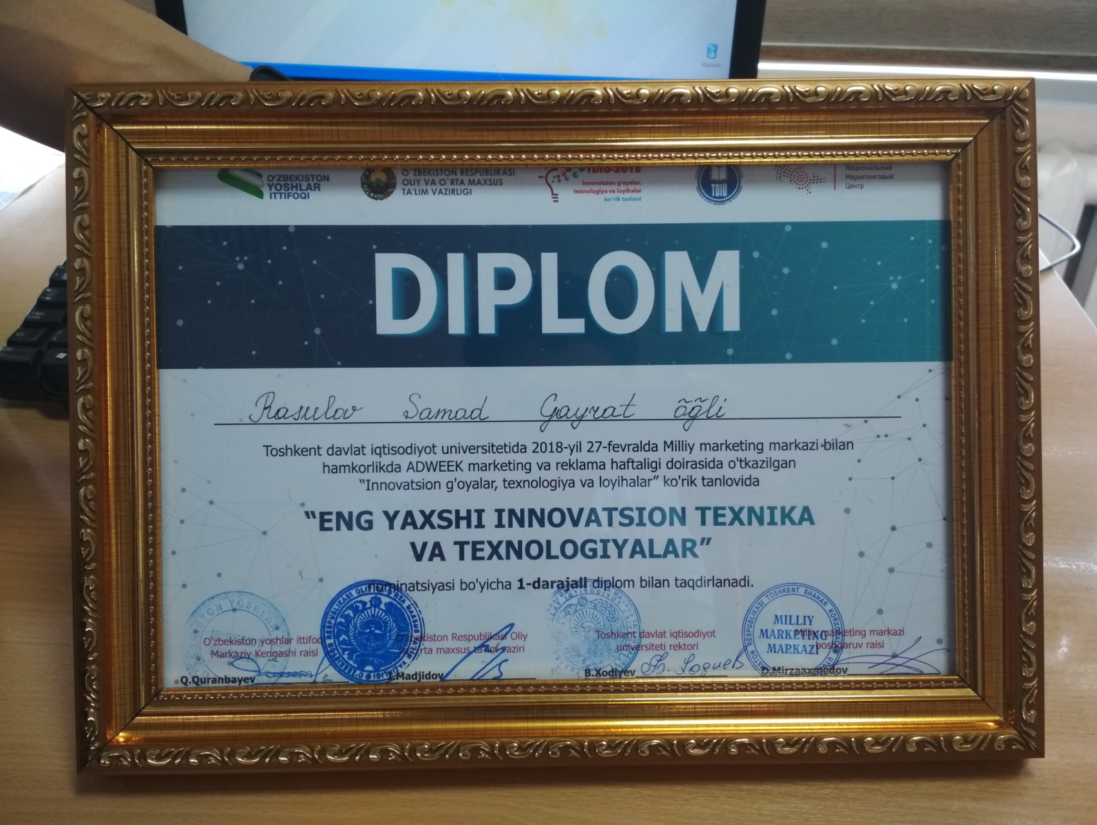 27 февраля 2018 года в Ташкентском государственном экономическом университете прошла инновационная ярмарка–выставка «Инновационные идеи, технологии и проекты», организованный Центральным советом Союза Молодежи Узбекистана, Министерством высшего и среднего специального образования Республики Узбекистан, Национальным маркетинговым центром Узбекистана.