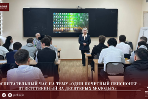 29 ноя / Все новости ВОСПИТАТЕЛЬНЫЙ ЧАС НА ТЕМУ «ОДИН ПОЧЕТНЫЙ ПЕНСИОНЕР – ОТВЕТСТВЕННЫЙ ЗА ДЕСЯТЕРЫХ МОЛОДЫХ»28 ноября 2025 года в рамках мероприятий, посвященных просветительским встречам с членами «Почетного совета» Филиала, среди студенческой аудитории состоялась встреча с педагогом-наставнико...