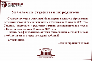 06 янв / Все новости Уважаемые студенты и их родители!Соответствующим решением Министерства высшего образования, науки и инноваций зимние каникулы продлены до 17 января 2023 года. Согласно настоящему решению зимняя экзаменационная сессия в Филиале начина...
