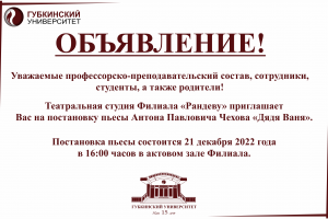 24 дек / Все новости Студенческая театральная студия «Рандеву» порадовала зрителей с постановкой пьесы А.П. Чехова «Дядя Ваня»21 декабря текущего года актовый зал Филиала собрал любителей классической литературы, ведь в этот день студенческая театральная труппа «Рандеву» удивила всех присутствующих мастерской игр...