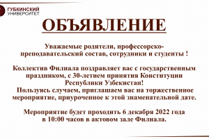 05 дек / Все новости КОНСТИТУЦИЯ – ОСНОВА НАШЕЙ СВОБОДНОЙ И БЛАГОПОЛУЧНОЙ ЖИЗНИ, ДАЛЬНЕЙШЕГО РАЗВИТИЯ И ПРОЦВЕТАНИЯ СТРАНЫВ преддверии 30 летней годовщины принятия Конституции Республики Узбекистан, в Филиале Российского государственного университета нефти и газа (НИУ) имени И.М. Губкина в городе Ташкенте, проходит...