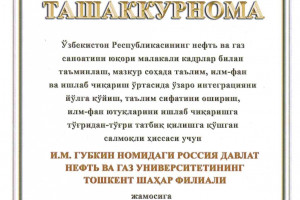 03 окт / Все новости БлагодарностьАО «Узбекнефтегаз» выражает благодарность коллективу Филиала Российского государственного университета нефти и газа (НИУ) имени И.М. Губкина в городе Ташкенте за весомый вклад в обеспечени...