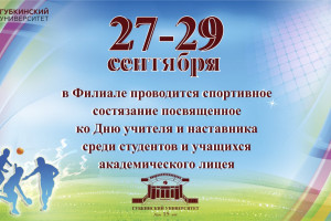 27 сент / Все новости В Филиале РГУ нефти и газа (НИУ) имени И. М. Губкина в городе состоялось торжественное открытие спортивных мероприятий, посвящённые Дню учителя и наставника27 сентября в Филиале состоялось торжественное открытие мероприятия по проведению гибридных спортивных состязаний между учащимися подшефного академического лицея и студентами Филиала, посвящённого Дню...