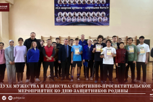 20 янв / Все новости В ДУХЕ МУЖЕСТВА И ЕДИНСТВА: СПОРТИВНО-ПРОСВЕТИТЕЛЬСКОЕ МЕРОПРИЯТИЕ КО ДНЮ ЗАЩИТНИКОВ РОДИНЫВ связи с 14 января — Днём защитников Родины — в Филиале было организовано духовно-просветительское и спортивное мероприятие среди студентов-юношей. Основной целью данного мероприятия стал...