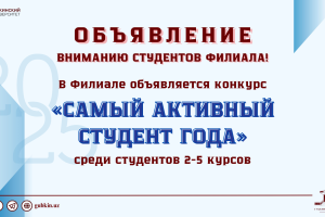 18 ноя / Все новости КОНКУРС «САМЫЙ АКТИВНЫЙ СТУДЕНТ ГОДА»В Филиале объявляется конкурс «Самый активный студент года» среди студентов 2,3,4 и 5 курсов. Основной целью конкурса «Самый активный студент года» является: подготовка зрелых...