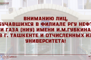24 авг / Все новости ВНИМАНИЮ ЛИЦ, ОБУЧАВШИХСЯ В ФИЛИАЛЕ РГУ НЕФТИ И ГАЗА (НИУ) ИМЕНИ И.М.ГУБКИНА В Г. ТАШКЕНТЕ И ОТЧИСЛЕННЫХ ИЗ УНИВЕРСИТЕТА!
