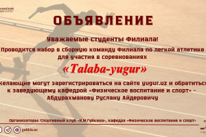 Проводится набор в сборную команду Филиала по легкой атлетике для участия в соревнованиях «Talaba-yugur». Желающие могут зарегистрироваться на сайте yugur.uz и обратиться к заведующему ка...