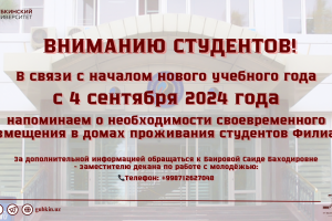 В связи с началом нового учебного года с 4 сентября 2024 года напоминаем о необходимости своевременного размещения в домах проживания студентов Филиала. За дополнительной информацией обращаться к Баи...
