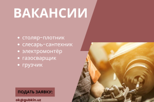Филиал Российского государственного университета нефти и газа (НИУ) имени И. М. Губкина в городе Ташкенте объявляет открытый конкурс для следующих вакантных должностей: столяр-плотник; слесарь-сан...