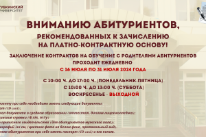 Заключение контрактов на обучение с родителями абитуриентов, рекомендованных к зачислению по внебюджетному набору (платно-контрактная форма обучения), проходит ежедневно с 16 по 31 июля 2024...