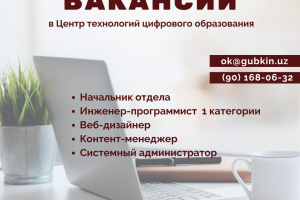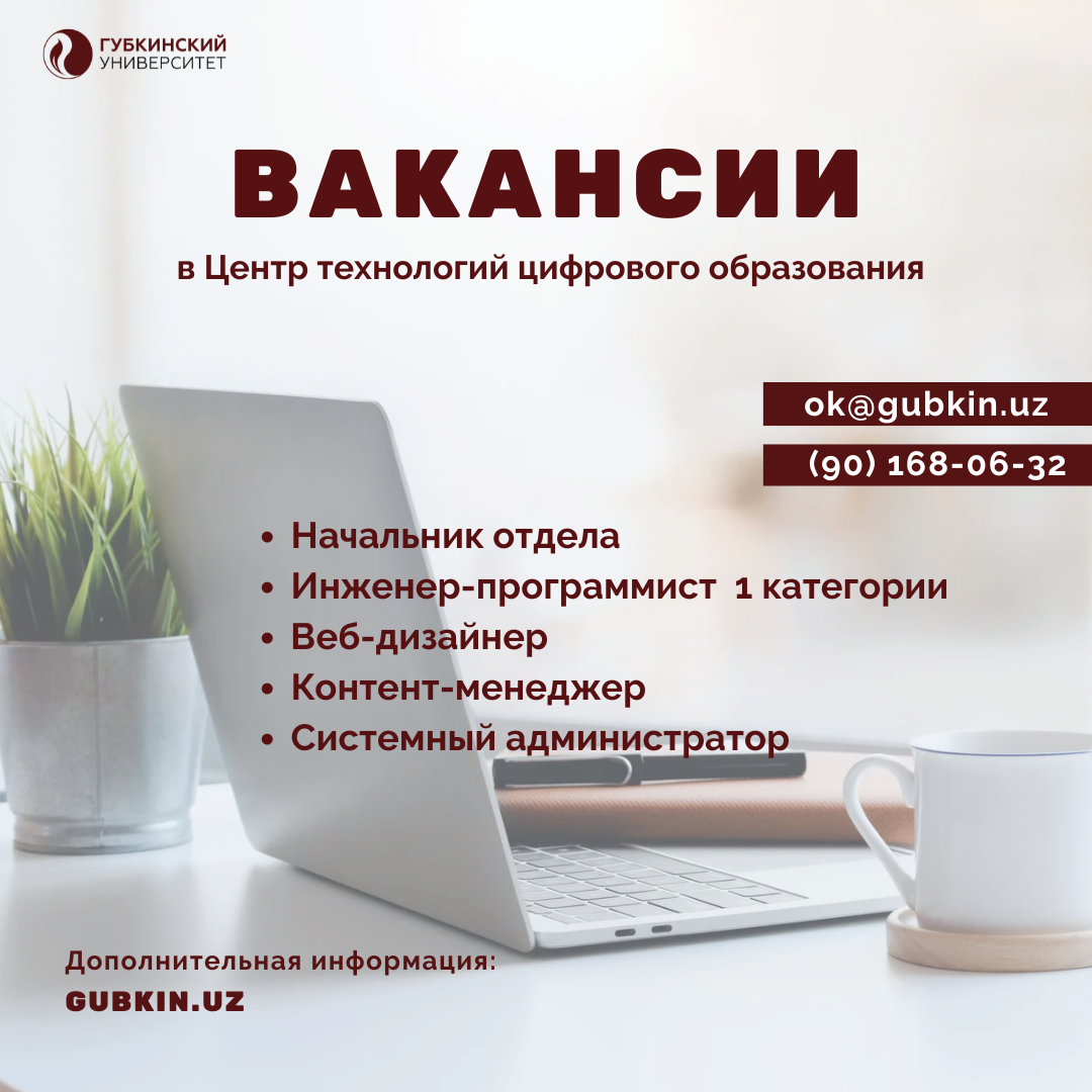 Филиал Российского государственного университета нефти и газа (НИУ) имени И. М. Губкина в городе Ташкенте объявляет открытый конкурс для следующих вакантных должностей Центра технологий цифрового обра...