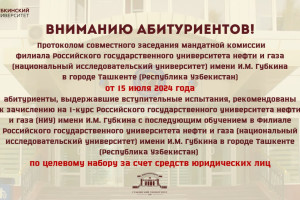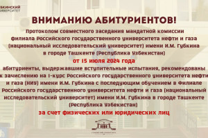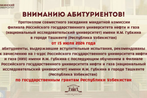 15 июль / Все новости Список абитуриентов, рекомендованных к зачислению для обучения за счет средств государственного гранта Республики Узбекистан