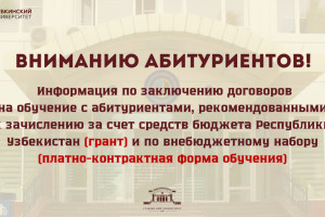 Заключение договоров на обучение с абитуриентами, рекомендованными к зачислению за счет средств бюджета Республики Узбекистан (грант), будет осуществляться ежедневно с 16 июля по 31 июля 2024 года: с...