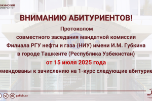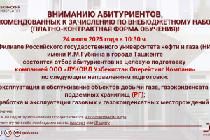 РЕКОМЕНДОВАННЫХ К ЗАЧИСЛЕНИЮ ПО ВНЕБЮДЖЕТНОМУ НАБОРУ (ПЛАТНО-КОНТРАКТНАЯ ФОРМА ОБУЧЕНИЯ)! 24 июля 2025 года в 10-30 ч. в Филиале Российского государственного университета нефти и газа (НИУ) и...