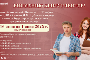 Приёмной комиссией Филиала РГУ нефти и газа (НИУ) имени И.М. Губкина в г.Ташкенте будет проводиться прием документов абитуриентов в период с 16 июня до 1 июля 2025 года. Преимущества обучения...