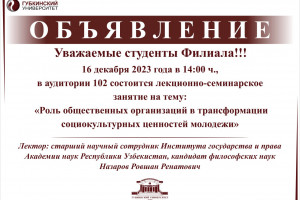 16 дек / Все новости «MA’RIFAT MAYDONI»В соответствии с приказом Министерства высшего образования, науки и инноваций Республики Узбекистан от 27 ноября 2023 года № 505 «О проведении на высоком уровне конкурса «Ma’ri...