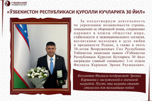 10 ноя / Все новости В ФИЛИАЛЕ ПРОШЕЛ КОНКУРС «МИЛЛИЙ ҚАДРИЯТЛАРНИНГ ЭНГ ФАОЛ ТАРҒИБОТЧИСИ»Вековые обычаи и традиции узбекского народа бережно хранятся и передаются из поколения в поколение. Как и у многих азиатских народов, большинство узбекских обычаев связано со знаменательными датами, о...