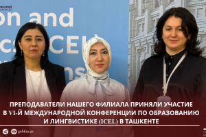 19 май / Все новости ПРЕПОДАВАТЕЛИ НАШЕГО ФИЛИАЛА ПРИНЯЛИ УЧАСТИЕ В VI-Й МЕЖДУНАРОДНОЙ КОНФЕРЕНЦИИ ПО ОБРАЗОВАНИЮ И ЛИНГВИСТИКЕ (ICEL) В ТАШКЕНТЕ