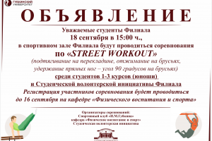 09 сент / Все новости ВНИМАНИЮ СТУДЕНТОВ!В Филиале проводится конкурс на получение стипендии имени Каюма Жалиловича Хаккулова. Стипендия учреждается для стимулирования и материальной поддержки студентов, обучающихся по направлениям подгото...