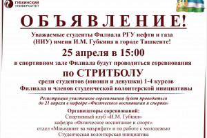19 апр / Все новости ВЫЕЗДНЫЕ ЗАНЯТИЯ НА БУХАРСКИЙ НЕФТЕПЕРЕРАБАТЫВАЮЩИЙ ЗАВОДВ соответствии с постановлением Правления АО «Узбекнефтегаз» от 28 января 2021 года № 4 «Об организации практических занятий для студентов Филиала РГУ нефти и газа (НИУ) имени И.М....